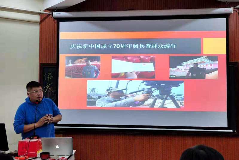 作为骨干摄像师宝老师在国庆盛典当天被安排在重要区域——东观礼台,仰观天安门城楼和阅兵指挥核心位置,俯视长安街和广场宏大盛况。他从摄像技术角度为大家讲解了自己岗位任务,以及摄像团队诸多机位的布局,勾画出多层次、多角度的阅兵“导视图”;通过展示千余个镜头,最短只有4秒场景画面的摄像脚本,讲述了摄像任务的艰巨挑战性,进而通过摄像机镜头呈现出“钢铁洪流”、“东风浩荡”的国威军威。“在现场,你能够深深地感到祖国心脏强大有力的跳动,长安街上排山倒海般的方阵,就像伟大民族奋勇前进的脉动。承担国家盛典重要拍摄任务,是我终生的荣幸,无比幸福!”曾经参加“九三”阅兵和朱日和沙场大阅兵拍摄工作的宝老师一番肺腑之言,令人感动。