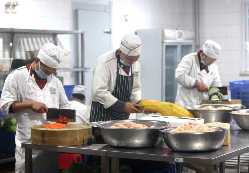 食堂工作人员正在切菜、备菜